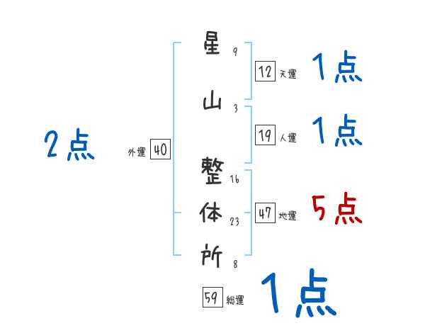 人運![]() | 星山整体所さんの人運は19画の1つ星!優れた才能を持ちますが、協調性が足りないことも。周りの人と協力する事を意識しましょう。 性格や才能などを表す2番目に重要な運勢です。人間関係や協調性、社会的な成功に影響します。主に20歳から50歳ぐらいまでの中年期の運勢を表します。 |