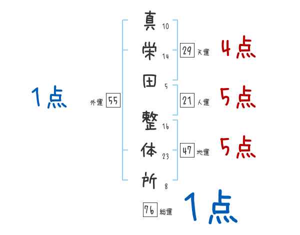 人運![]() | 真栄田整体所さんの人運は21画の5つ星!統率力がある。独立し成功する。名誉を手に入れる。 性格や才能などを表す2番目に重要な運勢です。人間関係や協調性、社会的な成功に影響します。主に20歳から50歳ぐらいまでの中年期の運勢を表します。 |