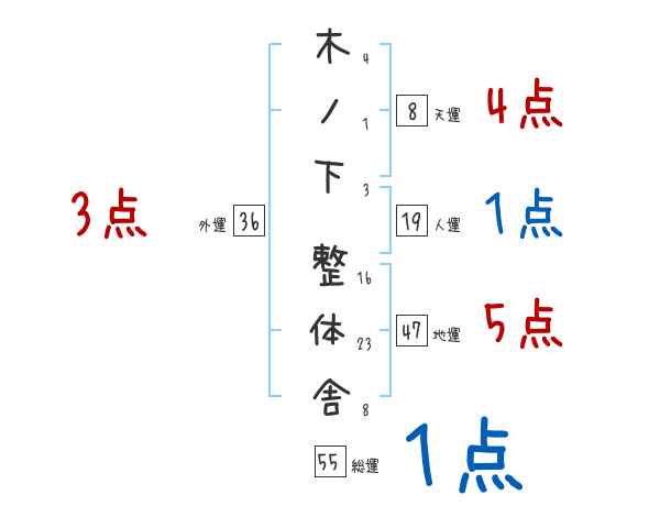 外運![]() | 木ノ下整体舎さんの外運は36画の3つ星!先見性が豊かです。多少神経質で苦労することも。 生活面を象徴する運勢です。外部から受ける影響力を表し、結婚運、家庭運や職場、環境への順応性を表します。 |