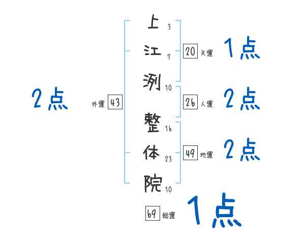 外運![]() | 上江洌整体院さんの外運は43画の2つ星!頑固な性格で独立心が強いかも。やや非現実的で浪費に注意しましょう。 生活面を象徴する運勢です。外部から受ける影響力を表し、結婚運、家庭運や職場、環境への順応性を表します。 |