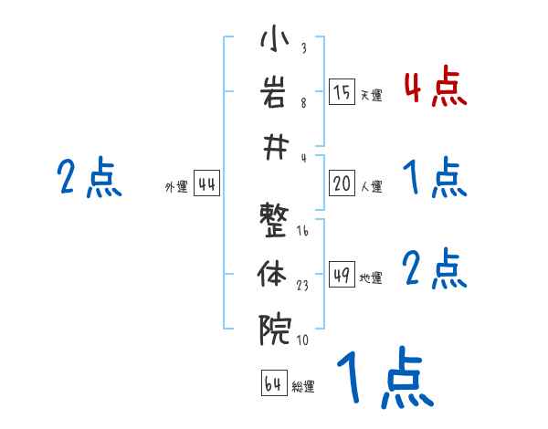 外運![]() | 小岩井整体院さんの外運は44画の2つ星!誠実で慎重な性格。物事を考えすぎないように注意しましょう。 生活面を象徴する運勢です。外部から受ける影響力を表し、結婚運、家庭運や職場、環境への順応性を表します。 |