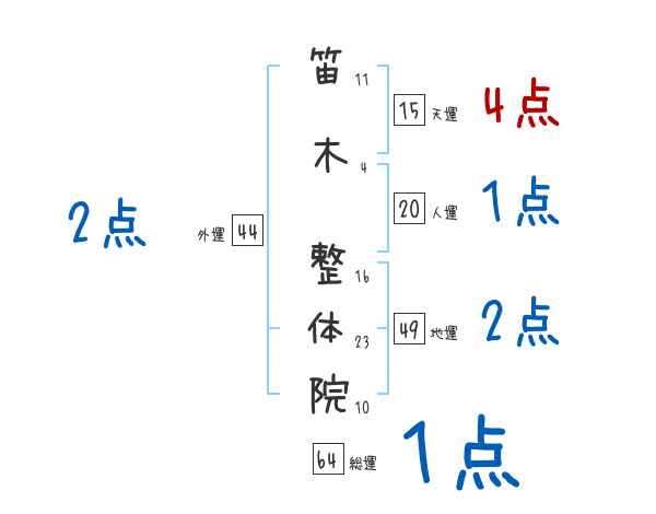 外運![]() | 笛木整体院さんの外運は44画の2つ星!誠実で慎重な性格。物事を考えすぎないように注意しましょう。 生活面を象徴する運勢です。外部から受ける影響力を表し、結婚運、家庭運や職場、環境への順応性を表します。 |