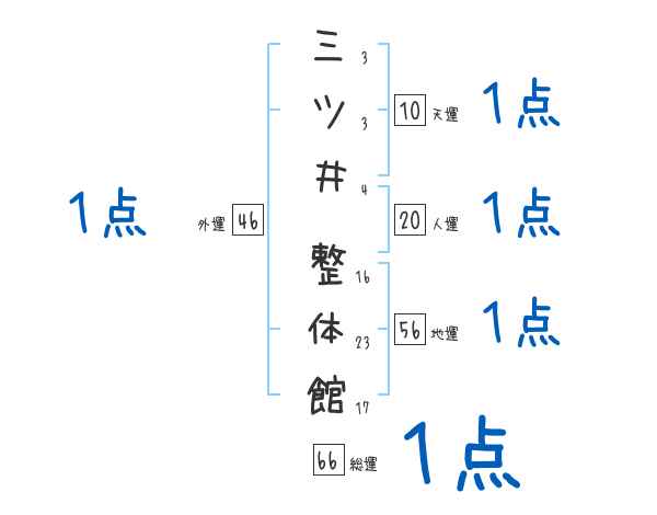総運![]() | 三ツ井整体館さんの総運は66画の1つ星!迷うことが多く挫折しやすい傾向が。辛抱強く物事に取り組みましょう。 あなたの人生を表す1番重要な運勢です。生涯を通じて影響する総合運となり、主に50歳以降の晩年期に影響を及ぼします。 |