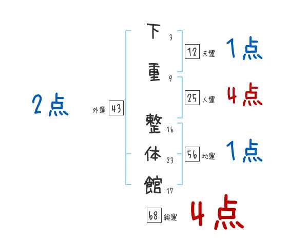 総運![]() | 下重整体館さんの総運は68画の4つ星!潜在能力が高く集中力が高い。勤勉に励み発展する。 あなたの人生を表す1番重要な運勢です。生涯を通じて影響する総合運となり、主に50歳以降の晩年期に影響を及ぼします。 |