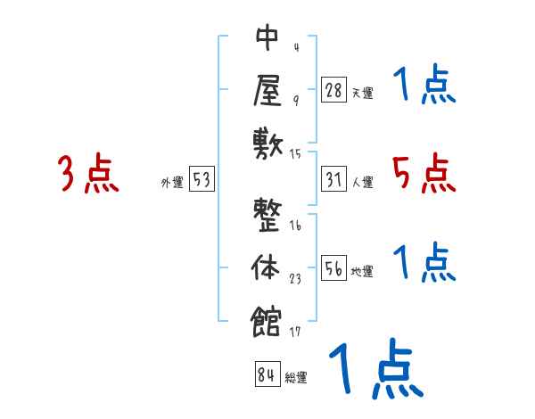 外運![]() | 中屋敷整体館さんの外運は53画の3つ星!やや見栄っ張りで虚栄心がある。散財に注意。 生活面を象徴する運勢です。外部から受ける影響力を表し、結婚運、家庭運や職場、環境への順応性を表します。 |