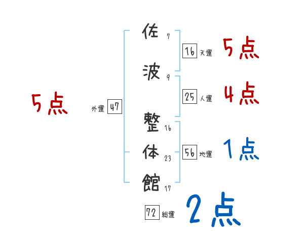 天運![]() | 佐波整体館さんの天運は16画の5つ星!人望が厚く大きく発展する。逆転成功が見える。 家系が持つ宿命的な運勢を表します。祖先から受け継いだ苗字ですので自分の力が及びません。家柄を象徴します。 |