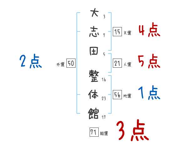 人運![]() | 大志田整体館さんの人運は21画の5つ星!統率力がある。独立し成功する。名誉を手に入れる。 性格や才能などを表す2番目に重要な運勢です。人間関係や協調性、社会的な成功に影響します。主に20歳から50歳ぐらいまでの中年期の運勢を表します。 |