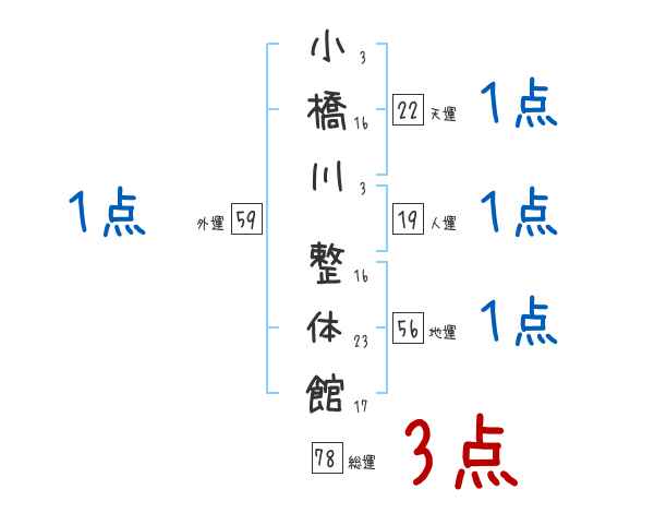 総運![]() | 小橋川整体館さんの総運は78画の3つ星!誠実な性格。信念が多少弱い。 あなたの人生を表す1番重要な運勢です。生涯を通じて影響する総合運となり、主に50歳以降の晩年期に影響を及ぼします。 |