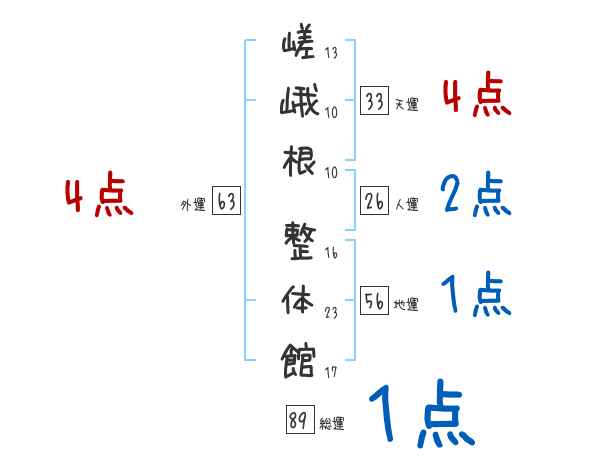 天運![]() | 嵯峨根整体館さんの天運は33画の4つ星!権力志向でプライドが高い。勇気があり運を切り開き成功する。 家系が持つ宿命的な運勢を表します。祖先から受け継いだ苗字ですので自分の力が及びません。家柄を象徴します。 |