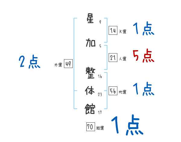 地運![]() | 星加整体館さんの地運は56画の1つ星!消極的で無気力になりがち。誠実な気持ちが必要でしょう。 個性を表す基礎的な運勢です。性格形成や対人関係、行動力など家庭環境に影響されます。主に誕生してから20歳くらいまでの若年期の運勢を表します。 |
