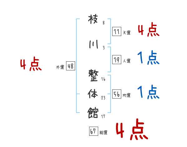 総運![]() | 枝川整体館さんの総運は67画の4つ星!幸運な人生。堅実な性格で調和し、周りの人に助けられる。 あなたの人生を表す1番重要な運勢です。生涯を通じて影響する総合運となり、主に50歳以降の晩年期に影響を及ぼします。 |
