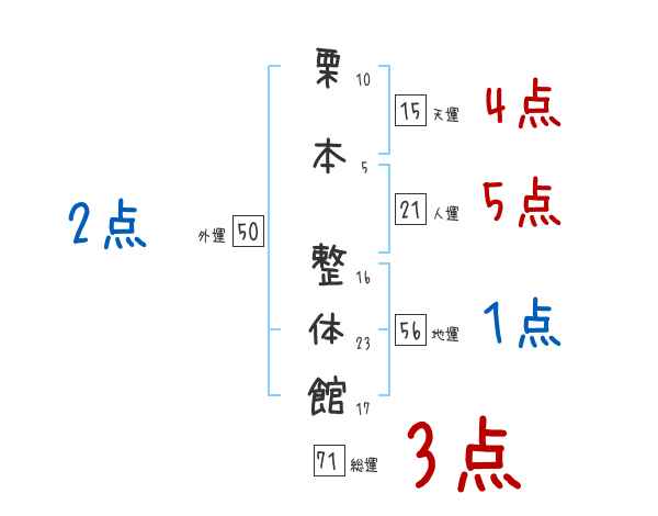 外運![]() | 栗本整体館さんの外運は50画の2つ星!浮き沈みが激しく不安定。しりすぼみに衰退しやすいので注意しましょう。 生活面を象徴する運勢です。外部から受ける影響力を表し、結婚運、家庭運や職場、環境への順応性を表します。 |