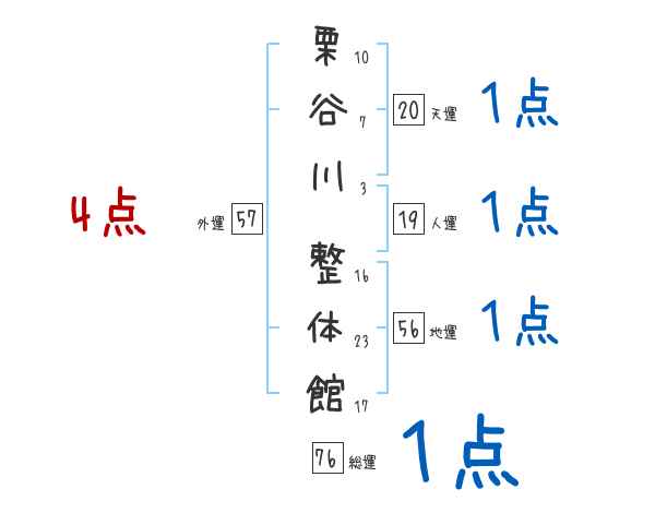人運![]() | 栗谷川整体館さんの人運は19画の1つ星!優れた才能を持ちますが、協調性が足りないことも。周りの人と協力する事を意識しましょう。 性格や才能などを表す2番目に重要な運勢です。人間関係や協調性、社会的な成功に影響します。主に20歳から50歳ぐらいまでの中年期の運勢を表します。 |