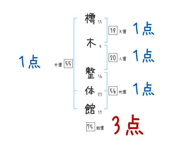 総運![]() | 樗木整体館さんの総運は75画の3つ星!慎重な性格で保守的。 あなたの人生を表す1番重要な運勢です。生涯を通じて影響する総合運となり、主に50歳以降の晩年期に影響を及ぼします。 |