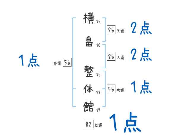天運![]() | 横畠整体館さんの天運は26画の2つ星!波瀾万丈かも。信頼できる人を大事にしましょう。 家系が持つ宿命的な運勢を表します。祖先から受け継いだ苗字ですので自分の力が及びません。家柄を象徴します。 |