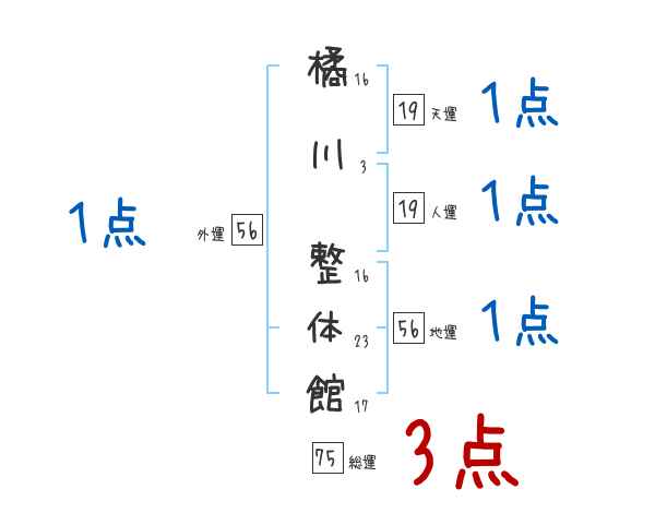 | 地運  | 橘川整体館さんの地運は56画の1つ星!消極的で無気力になりがち。誠実な気持ちが必要でしょう。個性を表す基礎的な運勢です。性格形成や対人関係、行動力など家庭環境に影響されます。主に誕生してから20歳くらいまでの若年期の運勢を表します。 |