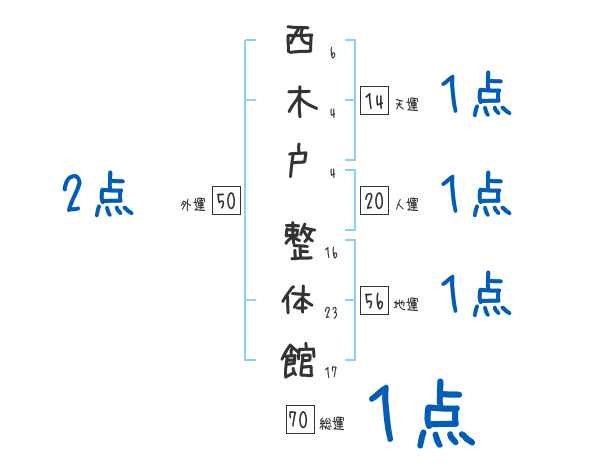 外運![]() | 西木戸整体館さんの外運は50画の2つ星!浮き沈みが激しく不安定。しりすぼみに衰退しやすいので注意しましょう。 生活面を象徴する運勢です。外部から受ける影響力を表し、結婚運、家庭運や職場、環境への順応性を表します。 |
