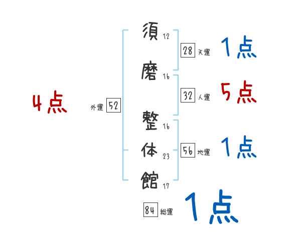 人運![]() | 須磨整体館さんの人運は32画の5つ星!柔軟性があり成功する。チャンスが多く金運が良い。 性格や才能などを表す2番目に重要な運勢です。人間関係や協調性、社会的な成功に影響します。主に20歳から50歳ぐらいまでの中年期の運勢を表します。 |