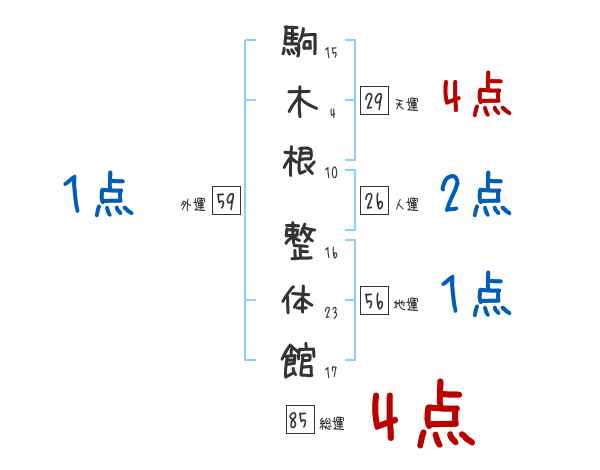 総運![]() | 駒木根整体館さんの総運は85画の4つ星!健康で安泰。協調性に優れ、財産に恵まれる。 あなたの人生を表す1番重要な運勢です。生涯を通じて影響する総合運となり、主に50歳以降の晩年期に影響を及ぼします。 |