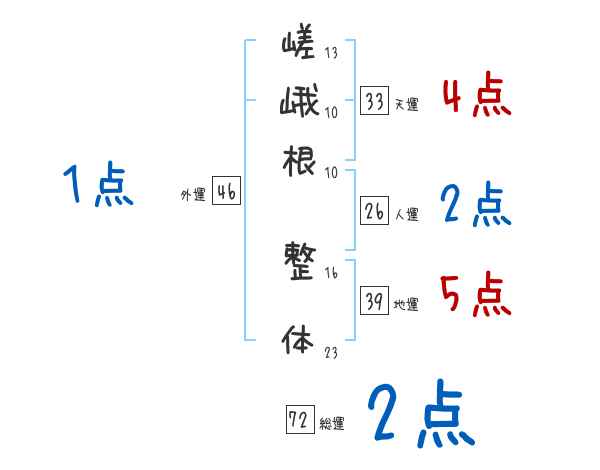 総運![]() | 嵯峨根整体さんの総運は72画の2つ星!災難が多く不安定な生活にならないように注意。明暗のある人生かも。 あなたの人生を表す1番重要な運勢です。生涯を通じて影響する総合運となり、主に50歳以降の晩年期に影響を及ぼします。 |
