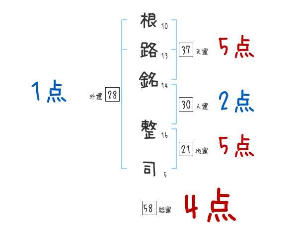総運![]() | 根路銘整司さんの総運は58画の4つ星!安定した生活。大器晩成タイプ。 あなたの人生を表す1番重要な運勢です。生涯を通じて影響する総合運となり、主に50歳以降の晩年期に影響を及ぼします。 |