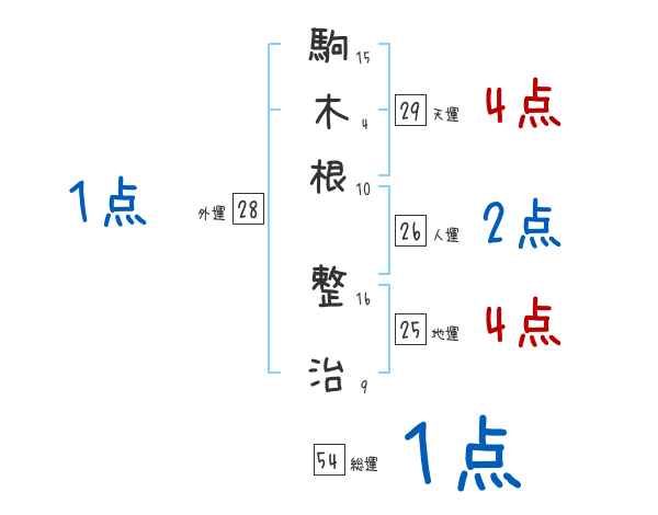 天運![]() | 駒木根整治さんの天運は29画の4つ星!完全主義で才能がある。厳格な心の持ち主。 家系が持つ宿命的な運勢を表します。祖先から受け継いだ苗字ですので自分の力が及びません。家柄を象徴します。 |