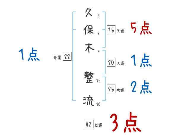 天運![]() | 久保木整流さんの天運は16画の5つ星!人望が厚く大きく発展する。逆転成功が見える。 家系が持つ宿命的な運勢を表します。祖先から受け継いだ苗字ですので自分の力が及びません。家柄を象徴します。 |