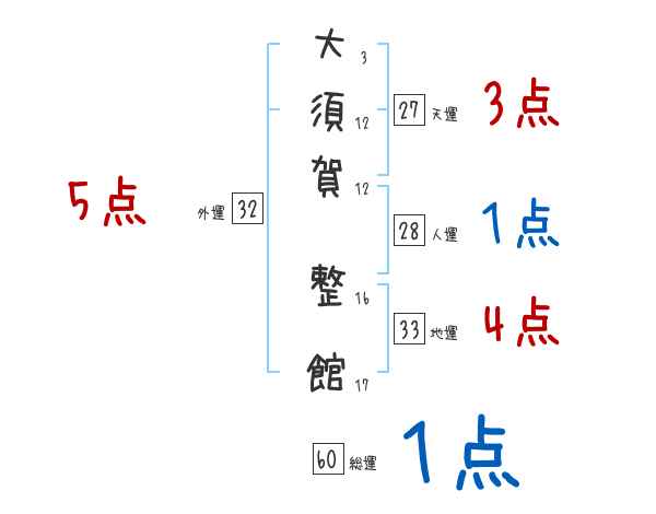 外運![]() | 大須賀整館さんの外運は32画の5つ星!柔軟性があり成功する。チャンスが多く金運が良い。 生活面を象徴する運勢です。外部から受ける影響力を表し、結婚運、家庭運や職場、環境への順応性を表します。 |