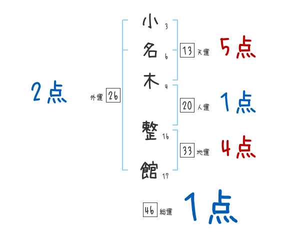 天運![]() | 小名木整館さんの天運は13画の5つ星!才能に恵まれ人気がある。名声を手に入れる。円満な人生。 家系が持つ宿命的な運勢を表します。祖先から受け継いだ苗字ですので自分の力が及びません。家柄を象徴します。 |