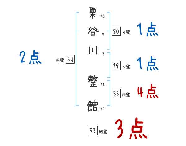 総運![]() | 栗谷川整館さんの総運は53画の3つ星!やや見栄っ張りで虚栄心がある。散財に注意。 あなたの人生を表す1番重要な運勢です。生涯を通じて影響する総合運となり、主に50歳以降の晩年期に影響を及ぼします。 |