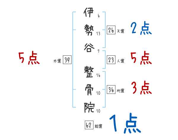 外運![]() | 伊勢谷整骨院さんの外運は39画の5つ星!社交性に優れ人望が厚い。人の上に立ち成功する。 生活面を象徴する運勢です。外部から受ける影響力を表し、結婚運、家庭運や職場、環境への順応性を表します。 |