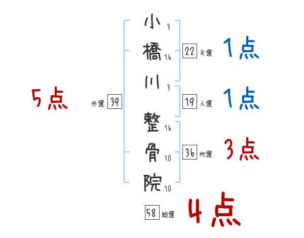 外運![]() | 小橋川整骨院さんの外運は39画の5つ星!社交性に優れ人望が厚い。人の上に立ち成功する。 生活面を象徴する運勢です。外部から受ける影響力を表し、結婚運、家庭運や職場、環境への順応性を表します。 |