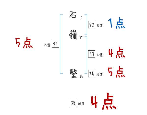 天運![]() | 石嶺整さんの天運は22画の1つ星!努力することが苦手ないっぽう手先が器用。芸術性にも優れる。 家系が持つ宿命的な運勢を表します。祖先から受け継いだ苗字ですので自分の力が及びません。家柄を象徴します。 |