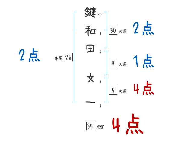 天運![]() | 鍵和田文一さんの天運は30画の2つ星!浮き沈みの激しさに注意しましょう。 家系が持つ宿命的な運勢を表します。祖先から受け継いだ苗字ですので自分の力が及びません。家柄を象徴します。 |