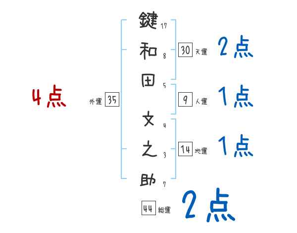 総運![]() | 鍵和田文之助さんの総運は44画の2つ星!誠実で慎重な性格。物事を考えすぎないように注意しましょう。 あなたの人生を表す1番重要な運勢です。生涯を通じて影響する総合運となり、主に50歳以降の晩年期に影響を及ぼします。 |