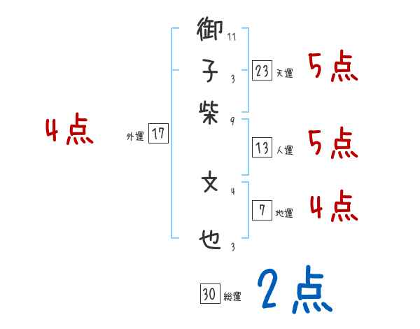 外運![]() | 御子柴文也さんの外運は17画の4つ星!積極的な行動力。地位を気づき財産を手に入れる。純粋な心と直感力。 生活面を象徴する運勢です。外部から受ける影響力を表し、結婚運、家庭運や職場、環境への順応性を表します。 |