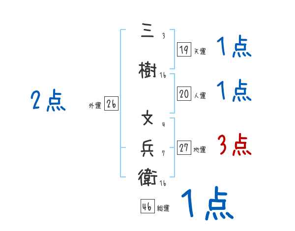 外運![]() | 三樹文兵衛さんの外運は26画の2つ星!波瀾万丈かも。信頼できる人を大事にしましょう。 生活面を象徴する運勢です。外部から受ける影響力を表し、結婚運、家庭運や職場、環境への順応性を表します。 |