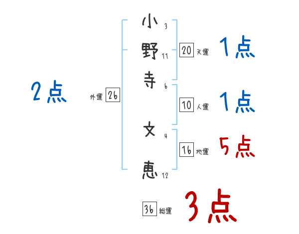 外運![]() | 小野寺文恵さんの外運は26画の2つ星!波瀾万丈かも。信頼できる人を大事にしましょう。 生活面を象徴する運勢です。外部から受ける影響力を表し、結婚運、家庭運や職場、環境への順応性を表します。 |