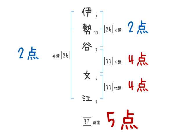 天運![]() | 伊勢谷文江さんの天運は26画の2つ星!波瀾万丈かも。信頼できる人を大事にしましょう。 家系が持つ宿命的な運勢を表します。祖先から受け継いだ苗字ですので自分の力が及びません。家柄を象徴します。 |