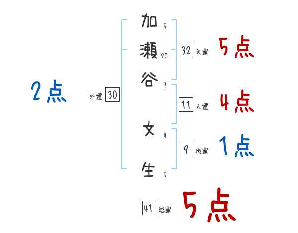 天運![]() | 加瀬谷文生さんの天運は32画の5つ星!柔軟性があり成功する。チャンスが多く金運が良い。 家系が持つ宿命的な運勢を表します。祖先から受け継いだ苗字ですので自分の力が及びません。家柄を象徴します。 |