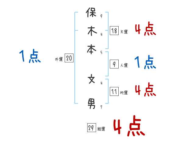 天運![]() | 保木本文男さんの天運は18画の4つ星!情熱的で剛気。忍耐力があり信頼される。 家系が持つ宿命的な運勢を表します。祖先から受け継いだ苗字ですので自分の力が及びません。家柄を象徴します。 |