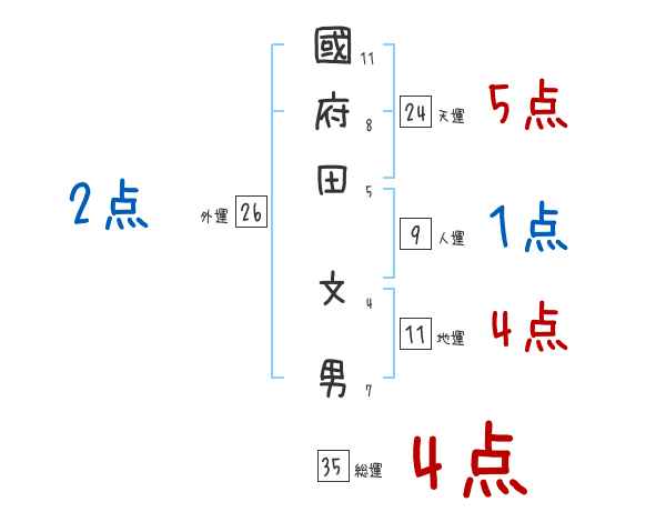 外運![]() | 國府田文男さんの外運は26画の2つ星!波瀾万丈かも。信頼できる人を大事にしましょう。 生活面を象徴する運勢です。外部から受ける影響力を表し、結婚運、家庭運や職場、環境への順応性を表します。 |