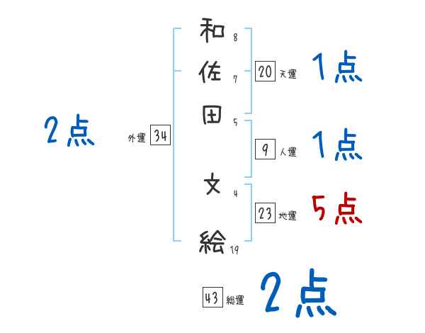総運![]() | 和佐田文絵さんの総運は43画の2つ星!頑固な性格で独立心が強いかも。やや非現実的で浪費に注意しましょう。 あなたの人生を表す1番重要な運勢です。生涯を通じて影響する総合運となり、主に50歳以降の晩年期に影響を及ぼします。 |