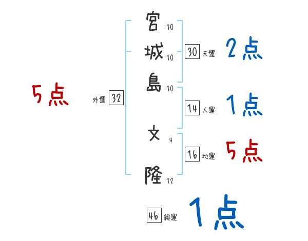外運![]() | 宮城島文隆さんの外運は32画の5つ星!柔軟性があり成功する。チャンスが多く金運が良い。 生活面を象徴する運勢です。外部から受ける影響力を表し、結婚運、家庭運や職場、環境への順応性を表します。 |