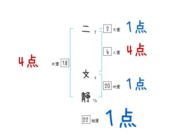 人運![]() | 二文静さんの人運は6画の4つ星!慎重な努力家で信頼を得る。誠実な精神で向上心に優れる。 性格や才能などを表す2番目に重要な運勢です。人間関係や協調性、社会的な成功に影響します。主に20歳から50歳ぐらいまでの中年期の運勢を表します。 |