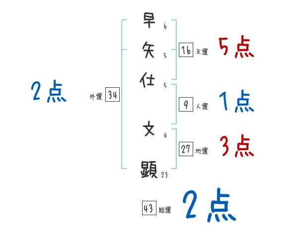 総運![]() | 早矢仕文顕さんの総運は43画の2つ星!頑固な性格で独立心が強いかも。やや非現実的で浪費に注意しましょう。 あなたの人生を表す1番重要な運勢です。生涯を通じて影響する総合運となり、主に50歳以降の晩年期に影響を及ぼします。 |