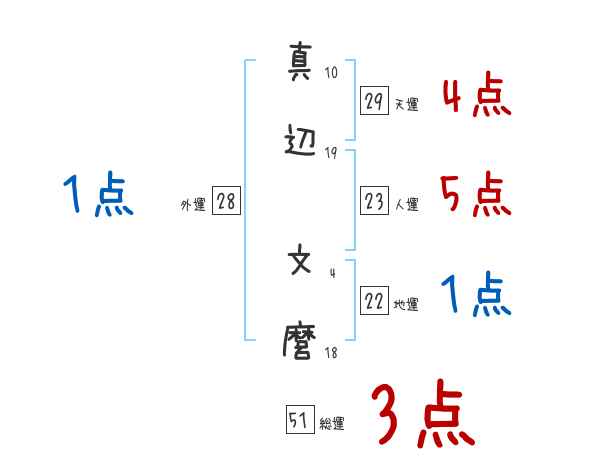 外運![]() | 真辺文麿さんの外運は28画の1つ星!家庭環境に注意。スポーツで活躍できる能力があるかも。 生活面を象徴する運勢です。外部から受ける影響力を表し、結婚運、家庭運や職場、環境への順応性を表します。 |