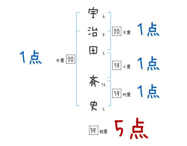 総運![]() | 宇治田斉史さんの総運は39画の5つ星!社交性に優れ人望が厚い。人の上に立ち成功する。 あなたの人生を表す1番重要な運勢です。生涯を通じて影響する総合運となり、主に50歳以降の晩年期に影響を及ぼします。 |