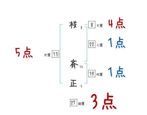外運![]() | 枝斉正さんの外運は13画の5つ星!才能に恵まれ人気がある。名声を手に入れる。円満な人生。 生活面を象徴する運勢です。外部から受ける影響力を表し、結婚運、家庭運や職場、環境への順応性を表します。 |