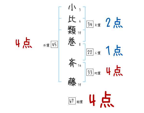 人運![]() | 小比類巻斉藤さんの人運は22画の1つ星!努力することが苦手ないっぽう手先が器用。芸術性にも優れる。 性格や才能などを表す2番目に重要な運勢です。人間関係や協調性、社会的な成功に影響します。主に20歳から50歳ぐらいまでの中年期の運勢を表します。 |